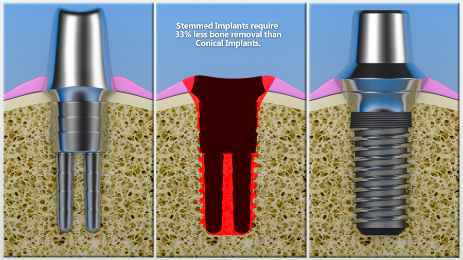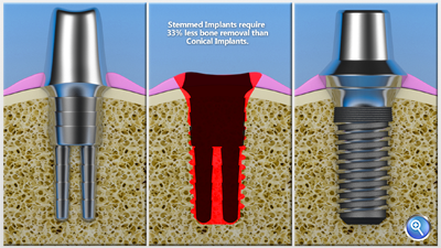 - In resisting luxation forces and immersion displacement removes 33% less tissue with the stemmed design.